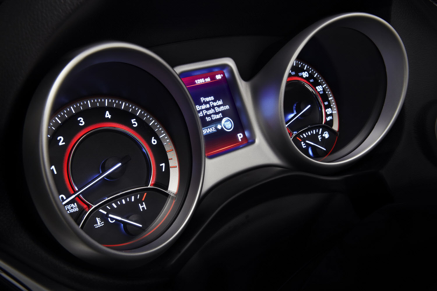 But perhaps the most rewarding surprise is Journey's new interior. Customers will step into world-class levels of craftsmanship and comfort. A beautifully crafted one-piece instrument panel sets the tone. A new, larger cluster with standard electronic vehicle information center (EVIC) is positioned in the center of the new gauges. It's a full-color display backlit in Dodge red lights, giving it a soft glow unlike any in the segment. New, integrated center stack bezels are less angular and more sculpted, and designers softened the radius to make more room for the driver's knees. The heating and cooling outlets are also redesigned to make them better looking and better functioning.