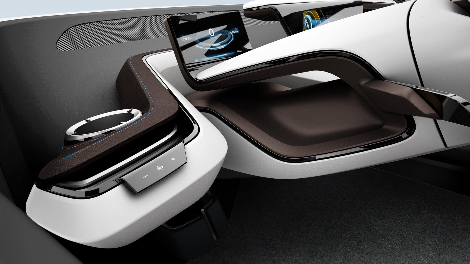 BMW i8 Concept sit in a highly integrated position low down in the car and are separated by the battery running lengthways through the interior. This longitudinal bisection of the cabin underlines the sporting and forward-looking character of the BMW i8 Concept interior.